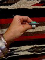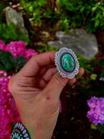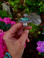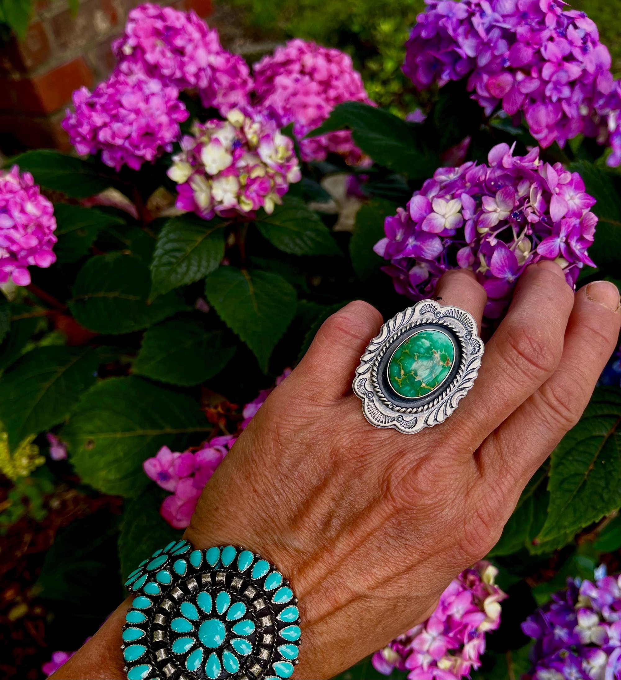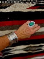 Set here in sterling silver in heavier gauge in a “shadow box” setting with stamped decorative border around the stone.