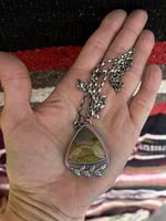 Cripple Creek hails from the Windy Ridge Mine of the Owyhee mountains and is one of the more abundant picture jaspers from the area. It is noted for classic panoramic landscapes. Set on a double backplate in sterling silver with 21” sterling chain. Handmade Design.