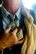 Handmade sterling silver bolo (adjustable) with Thunderbird turquoise from Nevada.