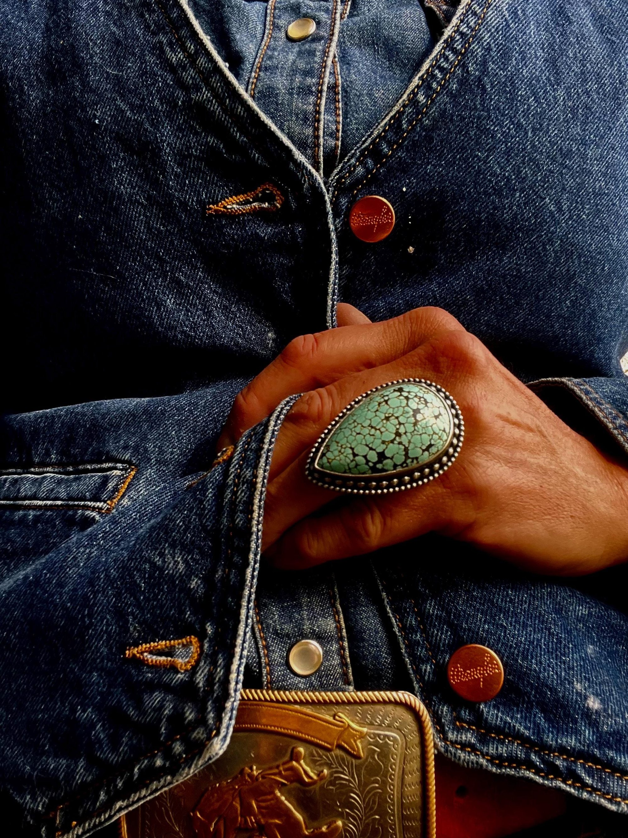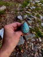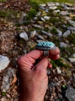 This particular Number 8 turquoise has outstanding matrix and color making it extremely rare and high grade Number 8 turquoise. It is all natural and there is no thick backing so what you see here is all turquoise set in sterling, measuring around 1” at its highest point.