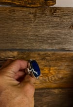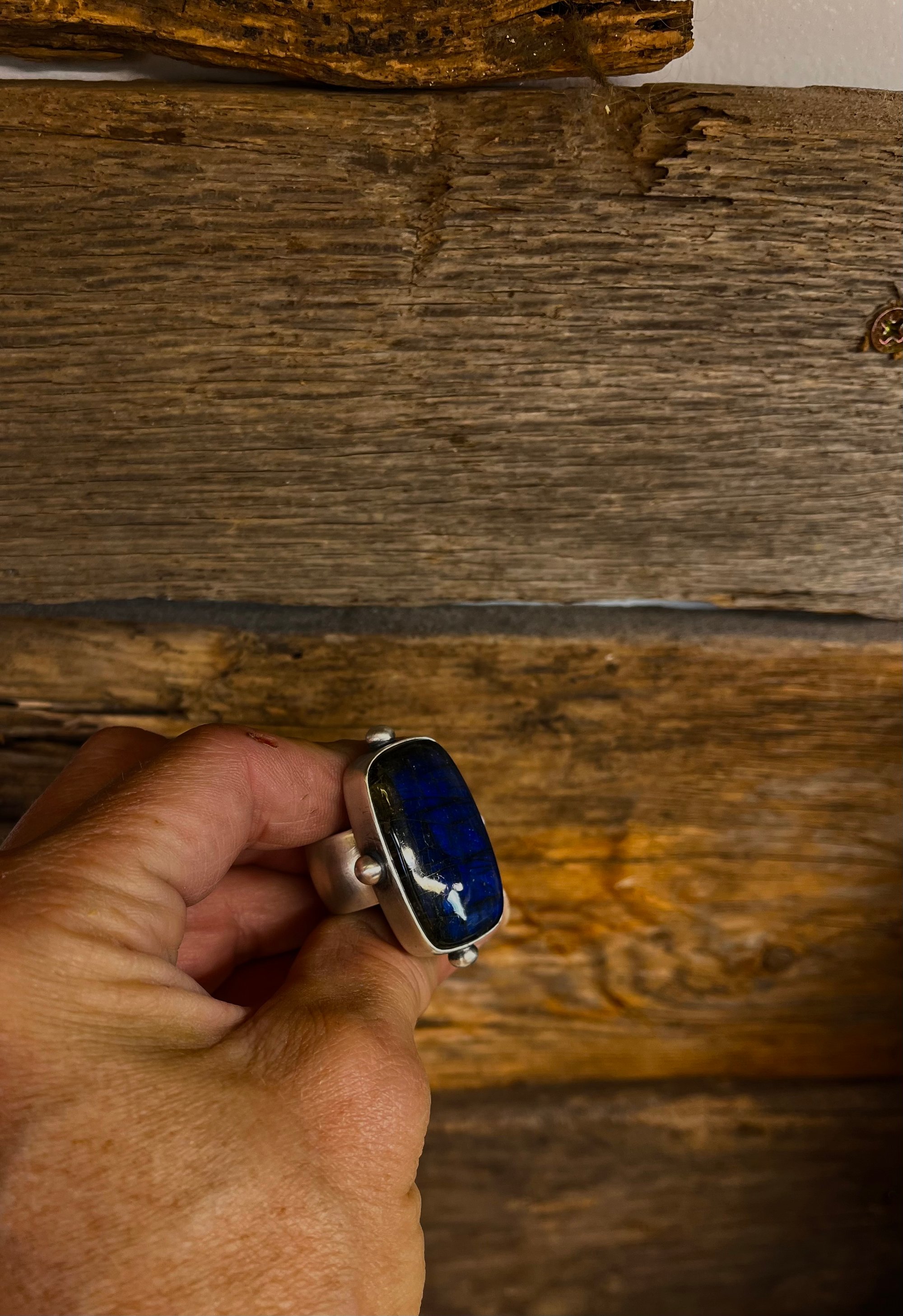 Gorgeous, thick slice of blue, high grade Labradorite set in heavier gauge sterling silver ring on a wide band. This one has some weight to it yet it is comfortable to wear it on your finger.