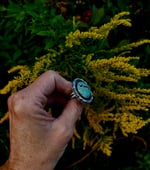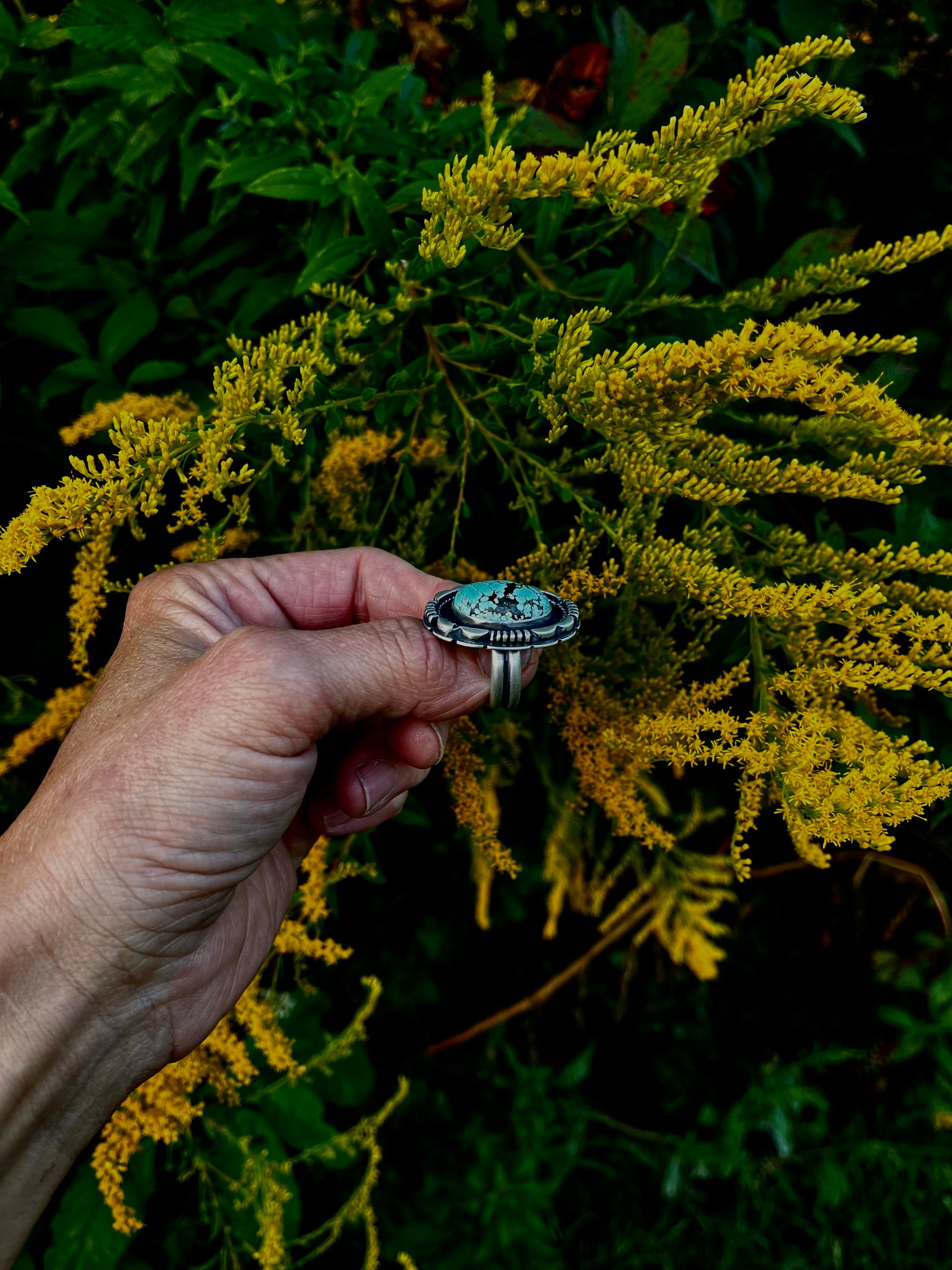 Pretty American turquoise's set in sterling in a minimal shadow box with a decorative frame. I love how this powder almost like blue of the stone contrasts the dark patina in the shadow box. The turquoise sits on a double back plate.